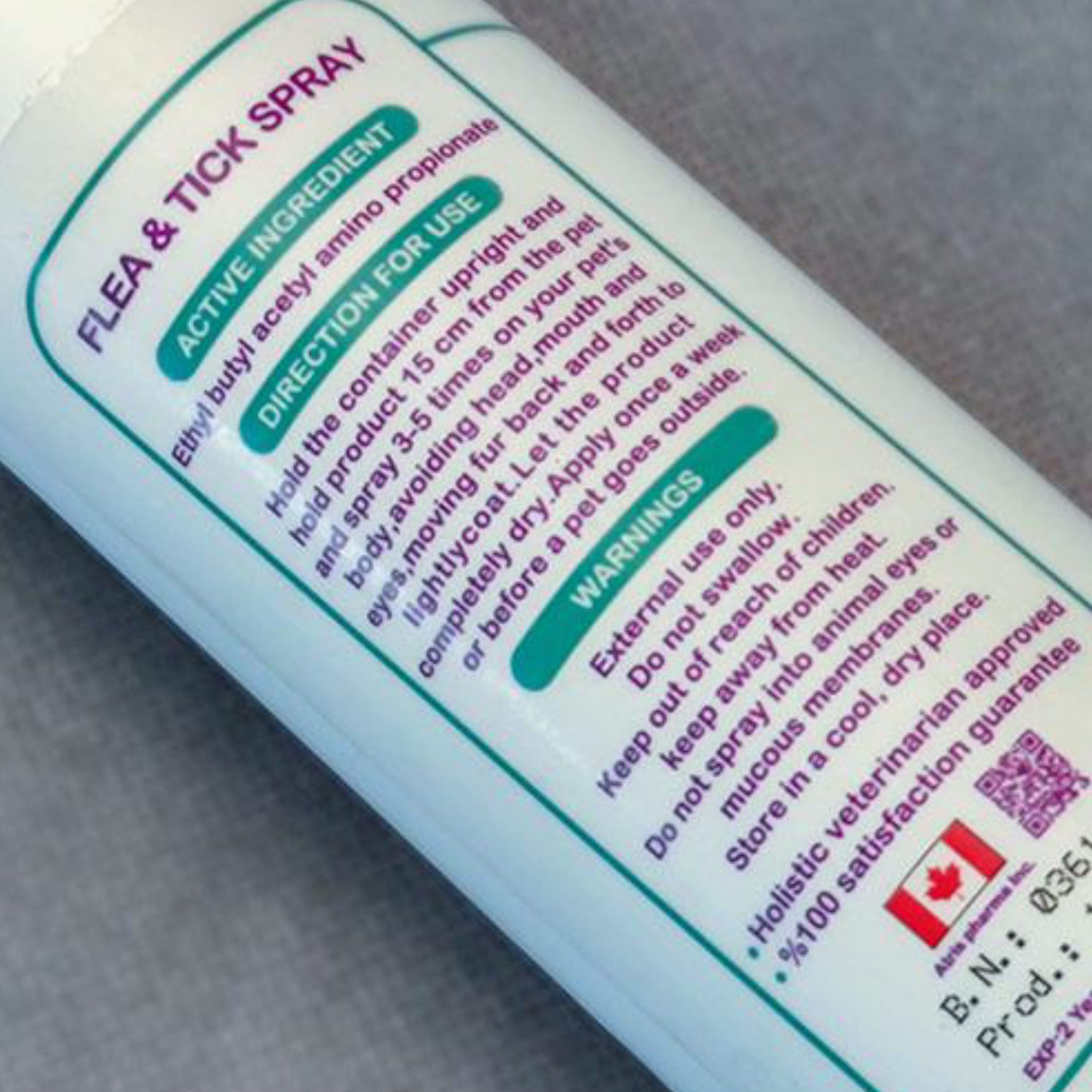 دارای مواد فعال مانند فایپرونیل (Fipronil) یا ترکیبات مشابه (در اسپریهای مشابه دیده شده است که از فایپرونیل برای از بین بردن سریع کک و کنه استفاده میکنند)