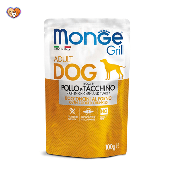 غذای مرطوب Monge Grill Adult Dog با طعم مرغ و بوقلمون، یک وعدهی کامل و خوشطعم برای سگهای بالغ است. این غذا شامل تکههای گوشت پختهشده در فر (Oven Cooked Chunkies) بوده و بافتی نرم و اشتهابرانگیز دارد. ترکیبات اصلی آن شامل مرغ و بوقلمون بهعنوان منابع با کیفیت پروتئین حیوانی هستند که به رشد عضلات و حفظ انرژی سگ کمک میکنند.